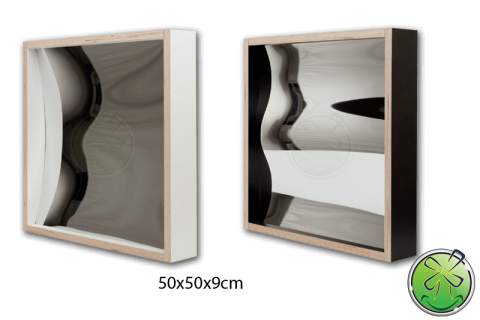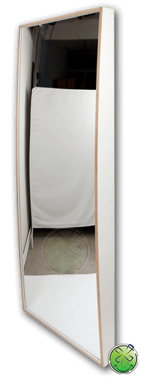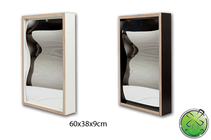 Un producto bellamente terminado nos enorgullece como productor. Es por eso que también hemos analizado cuidadosamente cómo terminamos las espaldas. Debido al peso, hemos optado por PVC espumado, mejor conocido como placa de espuma o bajo la marca Forex. El PVC espumado es ligero y relativamente fuerte, no atrae la suciedad y es muy asequible. Entregamos todos los espejos de risa con una parte posterior blanca de serie. Si compra un espejo de sonrisa con un marco negro y la parte posterior está visible, puede elegir tener una placa posterior negra montada en este menú. Como última opción, le ofrecemos madera contrachapada de abedul de 3 mm. Esto es imprescindible si tiene aplicaciones móviles para su (s) espejo (s) de sonrisa.