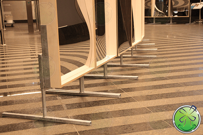 ¡Con estos soportes sobre ruedas hechos a la medida, nuestros espejos de risa XXL pueden ser traicionados como espejos de pantalla plegables!